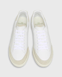 A stripped-down, tennis-inspired sneaker with suede accents. The design is slightly retro without drawing too much attention to itself... slightly anonymous with no visible logos... and in white leather, slightly more polished than the pair you're actually taking to the court. Aces all around.