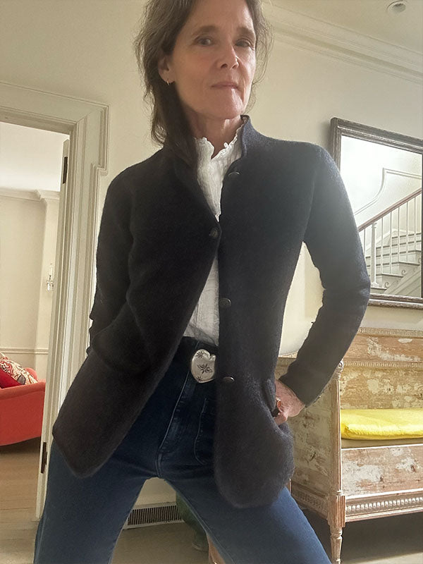 But finally I am getting to the clothes. This season you will see touches of my Alpine fantasy all over the collection. Some Swiss-inspired lace… leather novelty belts with an Austrian vibe… and a few sweaters embroidered with the flowers of the Engadin. But the easiest way to wear what I am feeling is our Tyrolean jacket. We ran this style last year and I wore it to death. One of my favorite things on the line. Last year’s brown has become this year’s beautiful charcoal grey that goes with just about anything… plus a pretty turquoisey blue and a bright navy. I had a hard time deciding which one I needed. It is sort of a sweater, so it is a softer version of what you might remember as Maria Von Trapp’s traveling outfit in the Sound of Music. Not at all costumey… just cool and classic and a touch folkloric. It has the stand-up collar of a men’s Trachten Jacket and beautiful brass buttons with little edelweiss flowers stamped on them.