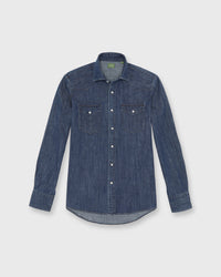 This is a true-blue Western shape down to the pearl snaps, pointed yoke, and triple-snap cuff, and we've updated it with a shorter length designed to wear untucked. There are two pointed snap pockets at the front, a modified spread collar, and an easy, slim-but-not-skinny shape. (Plus the same single-needle stitching, 22 stitches/inch, and flat-felled seams of all of our shirts.) It's made of a lightweight, washed indigo denim with visible highs and lows at the seams... it feels just right with the ruggedness of the Western silhouette.