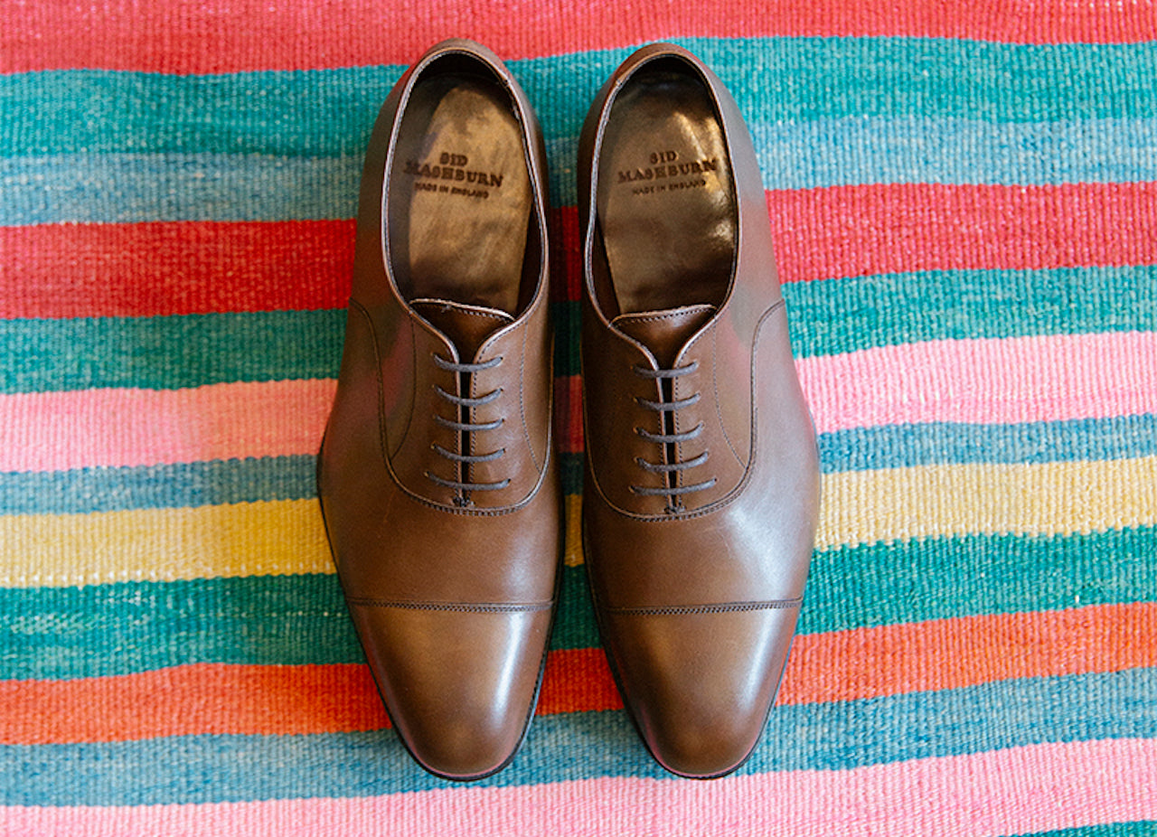 The cap-toe is a super-classic shoe, and we make ours on a special, deep-from-the-archives last in England. The last is like the heart of your shoe — it's that foot-shaped wooden mold that gives the shoe its shape during construction. The last establishes the overall silhouette, the width, the arch, the swing where the throat comes around to the toe... it's a super-important piece. So our cap-toe has presence, but not too much, and the toe is great because it's not too flat or too round or too pointed. If you're starting out, your first pair should probably be the espresso color, which is a darker brown with a little allover burnishing on it, not just on the toe. It goes with every color except for black. Charcoal, mid-grey, pearl grey, navy, any shade of blue, olive... the brown is always good. You can wear it with any suit, with dress trousers and a sport coat, or take it down a notch with jeans and a collared shirt — though you probably wouldn't wear it with a polo — but with jeans and a sport coat, it can be pretty fantastic. The versatility is incredible... there's no season you can't wear it.